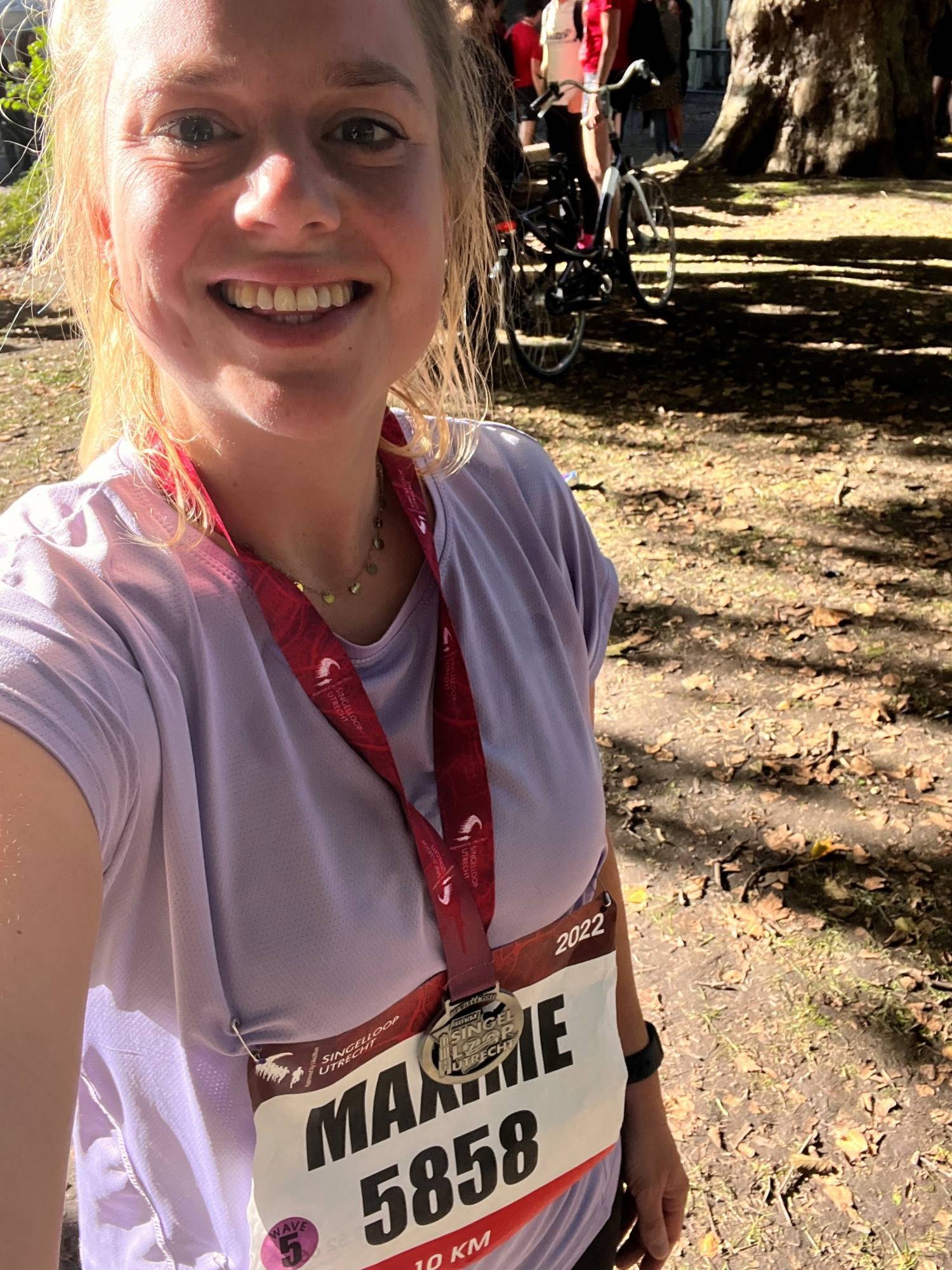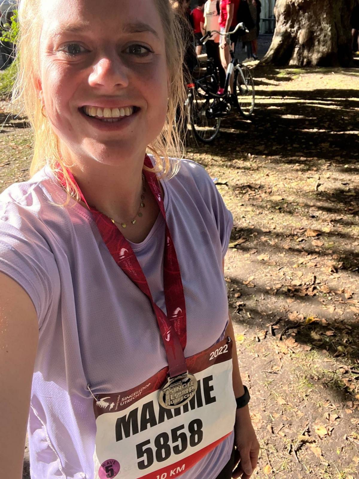 Ook haar vriendinnen lopen mee in Amsterdam. Ze zijn wat sneller en beginnen daarom in het voorste startvak. Een stukje achter hen heeft Maxime nog altijd last van de zenuwen waardoor ze in de trein al werd bevangen. ‘Ik zag dat mijn hartslag rond de 110 was.’ Voor het startschot wordt gegeven, gaat ze voor de zekerheid nog een keer of vier naar de wc. De eerste kilometers verlopen soepeltjes. Tijdens haar eerste officiële 10 kilometer in Utrecht had ze een tempo van 5:30 minuten per kilometer gelopen, nu zit ze rond de 6 minuten. Een tikkeltje te snel misschien, maar het gaat goed, dus houdt ze de vaart erin. Onderweg neemt ze geregeld een slok water, of een van de gelletjes die ze heeft meegenomen. ‘Daar had ik ook op getraind.’ Bij kilometer 12 komt de klad er opeens in. ‘De man met de hamer’, zegt Maxime. ‘Ik dacht echt: o god, ik wil stoppen. Maar tegelijk wilde ik dat absoluut niet. Ik verlaagde mijn tempo en dronk wat water. De kilometers gingen langzaam voorbij. En toen kwam het Vondelpark in zicht. Daar kreeg ik het heel zwaar. Maar ik dacht: doorgaan, je bent er bijna.’