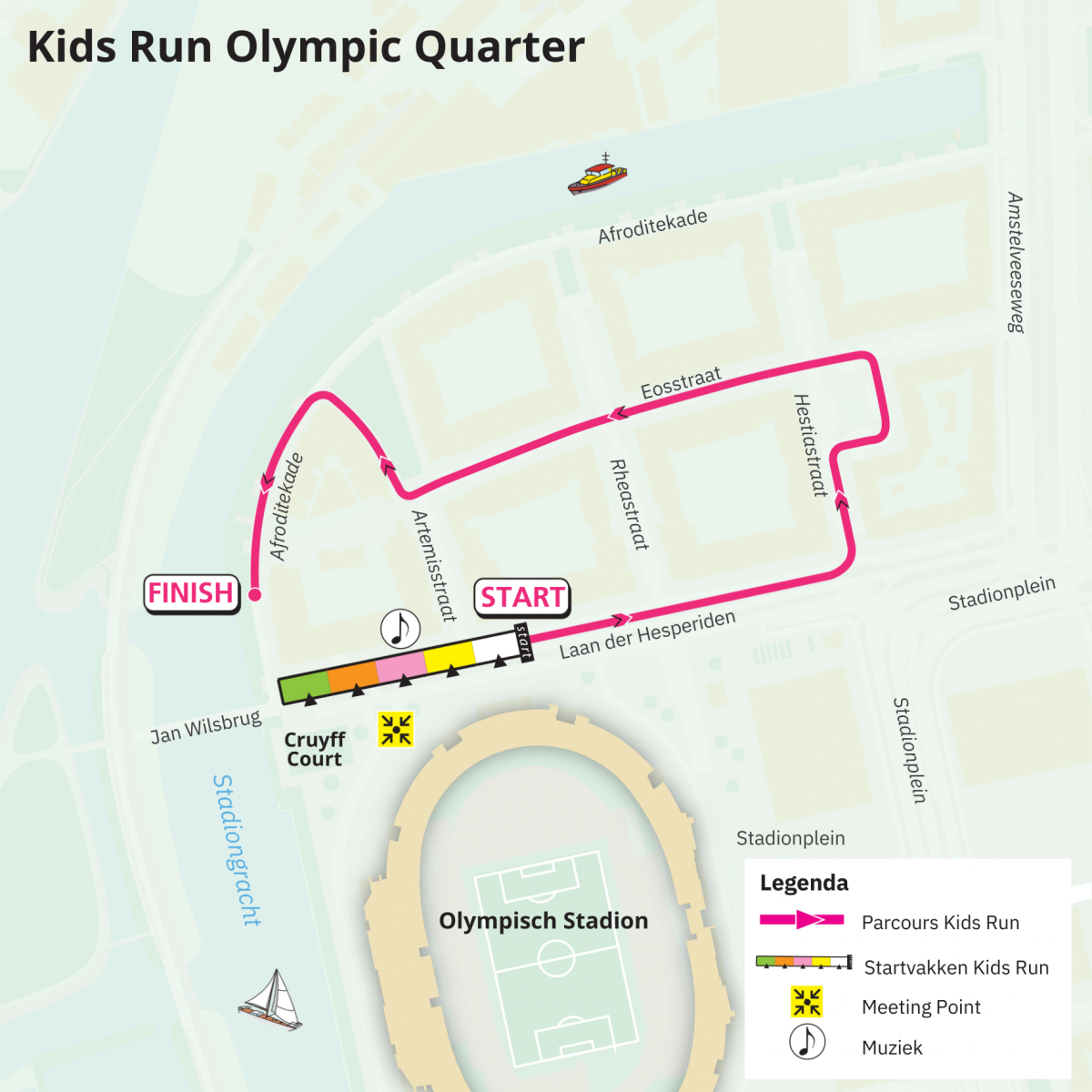 Nieuw dit jaar is dat beide afstanden finishen in het Olympisch Stadion. Na de finish ontvang je een medaille die speciaal voor deze editie in het teken van het jubileum staat, een unieke en blijvende herinnering! Ouders kunnen vanaf de tribune meekijken, maar het is niet mogelijk om vanaf de tribune bij de kinderen te komen. De finish is afgesloten voor publiek.