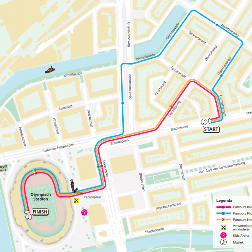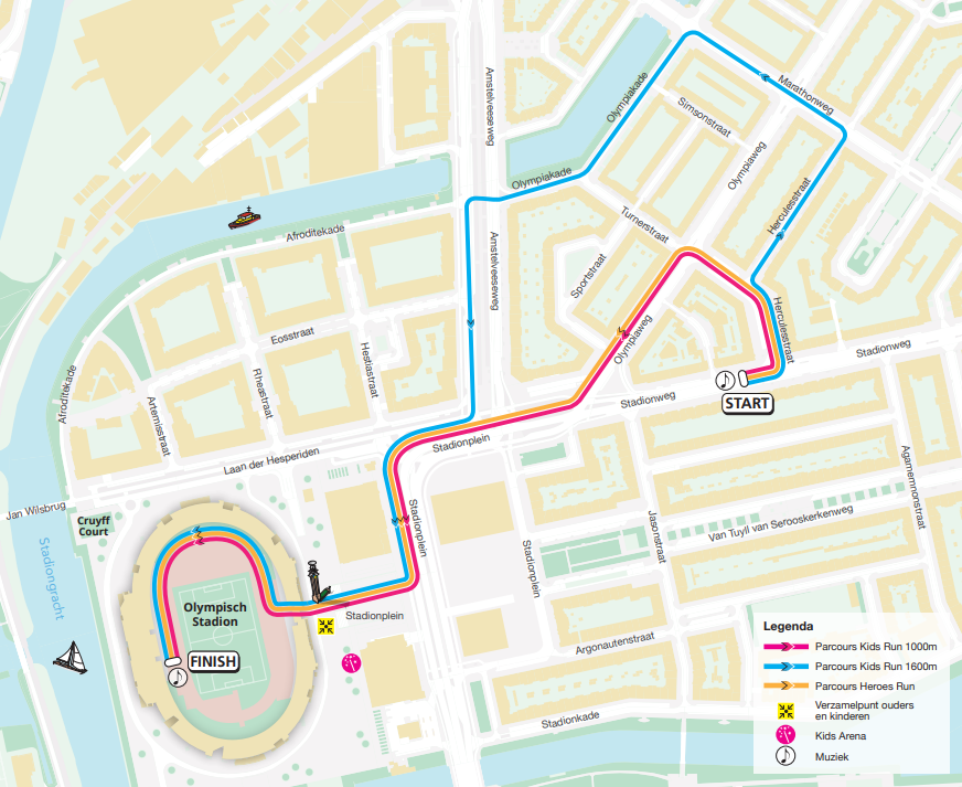 Een gezellig parcours over 1.000 en 1.600 meter is uitgezet vanaf de Stadionweg. De 1.000 meter maakt een kleine lus via de Olympiaweg en eindigt in het Olympisch Stadion. De 1.600 meter loopt via de Marathonweg, de Olympiakade terug via de Amstelveenseweg naar het Olympisch Stadion. Een ware marathonbeleving! Ouders kunnen overal langs het parcours staan om de kids aan te moedigen. Voor kinderen van 4, 5 en 6 jaar (laatste startvak) is het toegestaan dat de ouders meelopen. Als je ouder bent, mogen jouw ouders je wel naar het startvak brengen en je weer ophalen bij de finish.