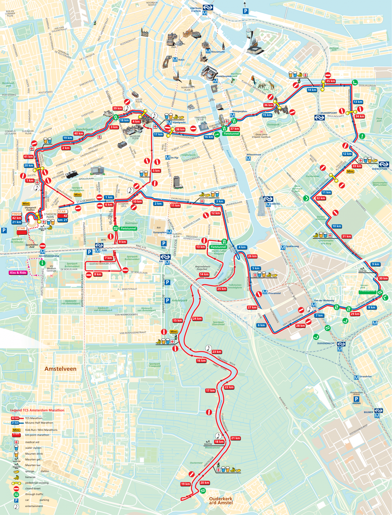 Het parcours in Amsterdam staat bekend om het vlakke, snelle en historische karakter. De start en finish vinden plaats in het historische Olympisch Stadion. Dit laat elk jaar weer een onvergetelijke indruk achter, met dank aan de aanwezigheid van de supporters op de ere- en marathontribune. Het parcours van de Marathon volgt een deel van het parcours van de Olympische Spelen in 1928 langs de Amstel, langs statige herenhuizen en enige molens. Dit landelijke traject biedt fraaie uitzichten (onder meer op de Arena) en geeft een indruk van de enorme bedrijvigheid die dagelijks op de Amstel heerst.